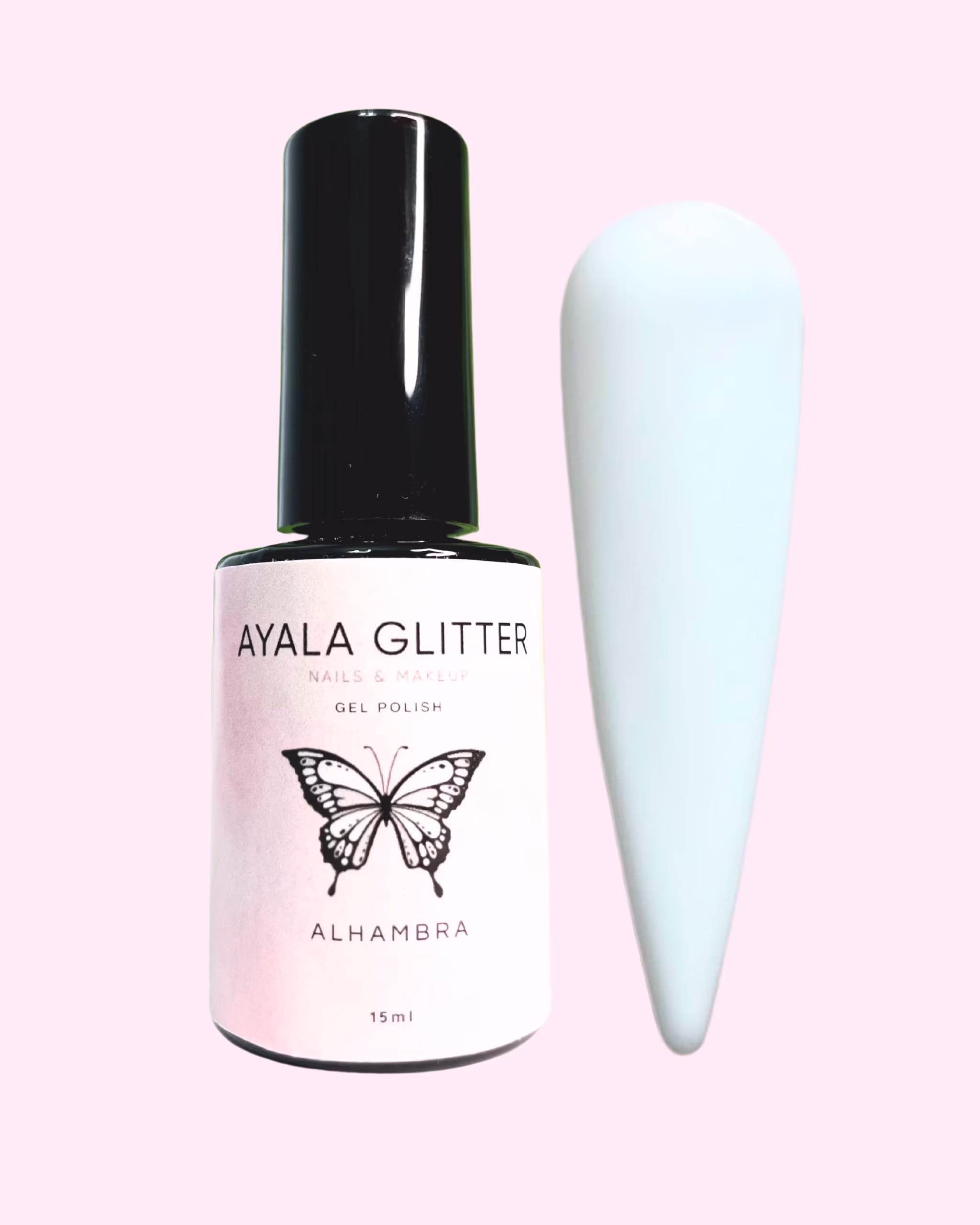 Logra un acabado perfecto con Alhambra, el esmalte gel milky blanco de Ayala Glitter. Este tono luminoso es ideal para quienes buscan un look fresco y elegante. Pigmentadión media baja.
