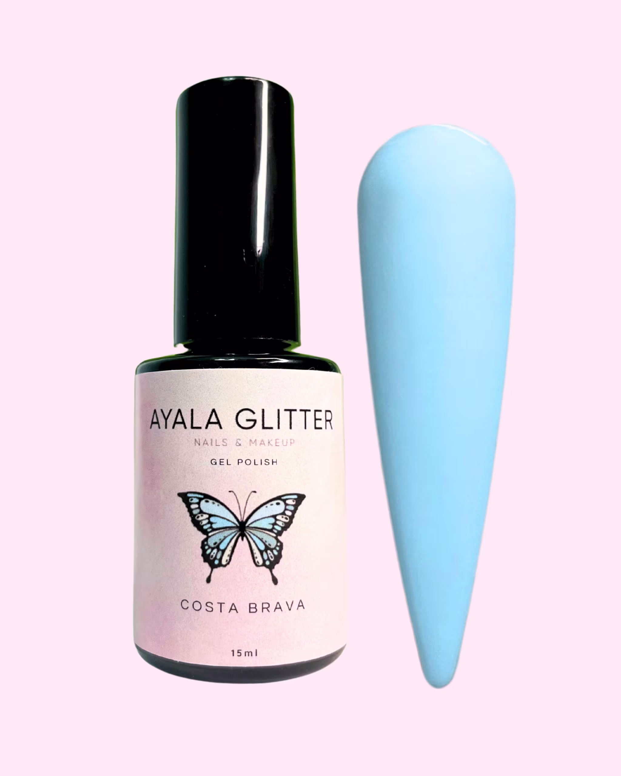 Disfruta de la calma del esmalte gel azul celeste Costa Brava de Ayala Glitter, un tono inspirado en la serenidad del Mediterráneo. Formulado sin los alérgenos Hema, DiHema ni TPO, este esmalte es la opción perfecta para quienes buscan un acabado impecable sin comprometer su bienestar.
